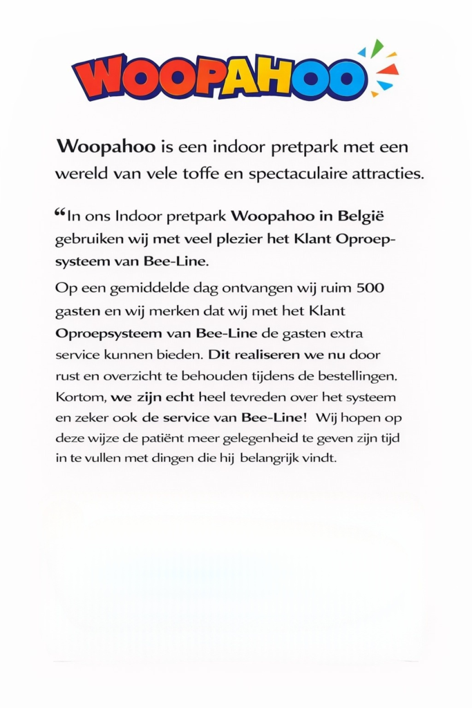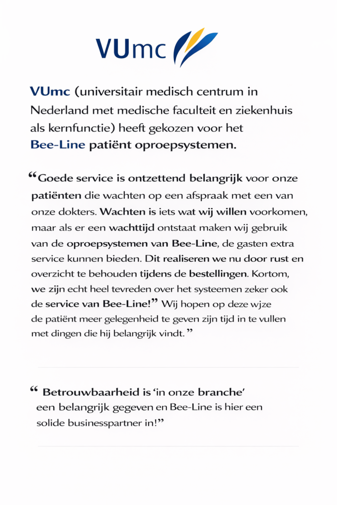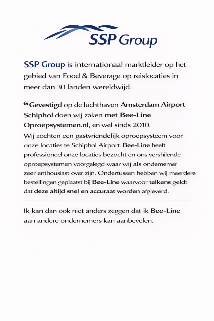 Bij Bee-line B.V. staat klanttevredenheid in het hart van alles wat we doen. Onze klanten waarderen vooral de betrouwbaarheid, gebruiksvriendelijkheid en innovatieve kwaliteit van onze oproepsystemen. Of het nu gaat om een druk restaurant, een hotel, een logistiek terrein of een zorginstelling — onze draadloze oplossingen zorgen voor snelle communicatie, betere samenwerking en efficiëntere werkprocessen.
