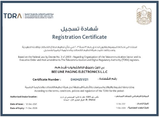 We are officially certified by the TDRA (Telecommunications and Digital Government Regulatory Authority) in the UAE, ensuring full compliance with regional telecom and safety standards. Additionally, our products meet quality expectations upheld by Dutch regulatory bodies, reflecting our commitment to safety, reliability, and performance.